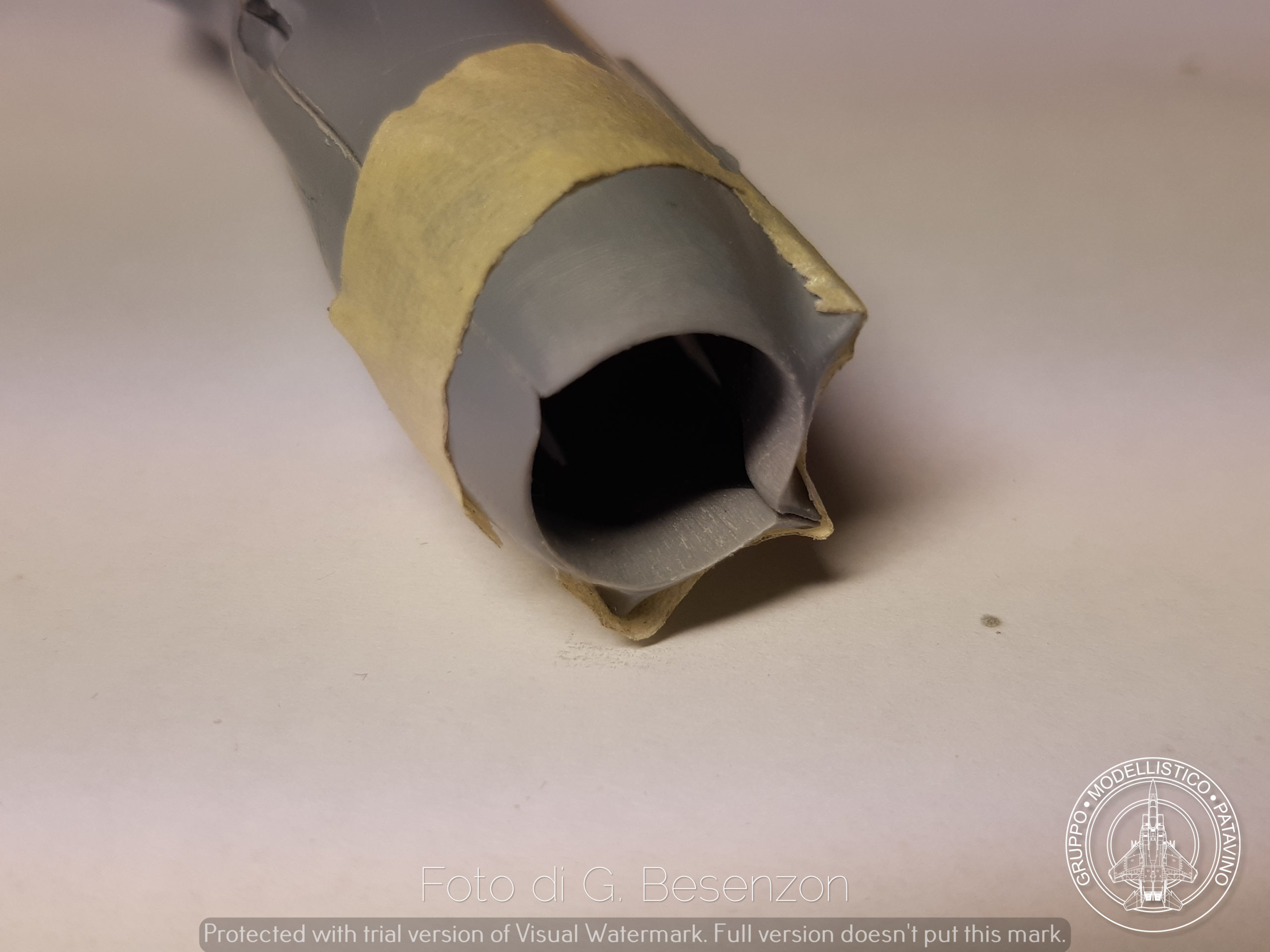 Guardando le foto dell’aereo reale la prima cosa che ho notato è stata la parte terminale del cono di scaricodel kit (foto 1)… assolutamente improponibile. Dovevo trovare il sistema per assottigliarlo una volta montata la fusoliera, ma senza avere il cono che scorre all’interno che mi ostacolava. Osservando le foto ho visto che il cono terminale di fatto è un tubo: allora ho pensato ad un sistema per farlo, una siringa tagliata a misura e lasciata un po’ abbondante all’esterno in modo da poter lavorare più comodamente il terminale e assottigliarlo adeguatamente (foto 2-3-4).