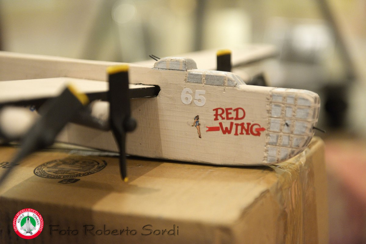L’obiettivo che da subito ci eravamo posti era di realizzare le eliche in movimento, il più possibile credibili. Dopo diverse sperimentazioni si è quindi pensato di realizzarle in questo modo: facendo girare con l’ausilio di un trapanino una delle eliche del bombardiere fotografandola poi con vari tempi di esposizione. Trovata la foto più realistica la si è stampata su foglio trasparente di acetato. Ne abbiamo sovrapposte due per elica, tenendole leggermente sfalsate per dare un effetto ancora più incisivo e montandole su tre motori. Nel quarto invece si è messa l’elica in “bandiera” simulando l’avaria del motore colpito dai caccia. Il risultato finale, a nostro avviso, è estremamente credibile.