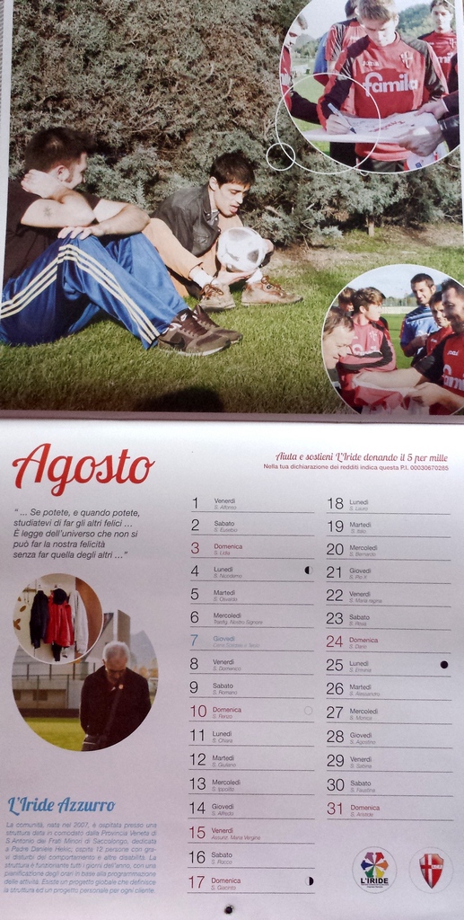 Questo “mondo” lavora spesso in silenzio, quasi invisibilmente; chi dona il proprio aiuto è spesso schivo nel farlo sapere, lo fa e basta. Quando non si cerca un ritorno o un tornaconto lo spessore del gesto assume una dimensione vera. Ci sono momenti però in cui occorre farsi vedere, per far conoscere a tutti che esiste un lato buono della nostra società e che esso ha bisogno anche di mezzi e di incoraggiamento. E’ il caso del nostro socio Andrea Ferretto, che lavora presso la Società Cooperativa Sociale L’Iride, con sede a Selvazzano (PD), che ci ha parlato del calendario che la Cooperativa ha preparato per il 2014 e che quest’anno vede il Calcio Padova come promotore insieme all’associazione.