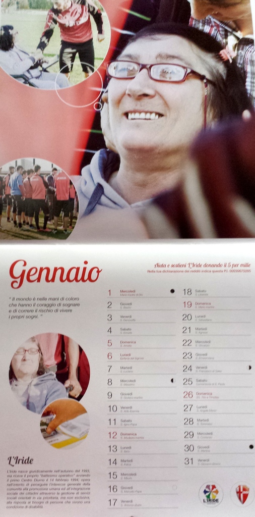 Il calendario, delle dimensioni 28x 56 cm, riporta per ogni mese una foto nella parte superiore con i giocatori del Calcio Padova e ragazzi seguiti da L’Iride; nel riquadro inferiore il calendario, completo del Santo del giorno e delle fasi lunari, oltre ad una breve descrizione mese per mese di cosa è e come è strutturata la Cooperativa. Stampato completamente a colori su carta patinata e copertina in cartoncino, costa 7,00 Euro a copia. Ma noi sappiamo il valore che questo piccolo prezzo assume: il ricavato servirà a finanziare le attività della Cooperativa ed attivarne delle nuove.